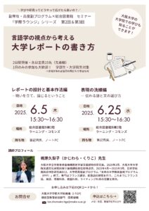 - 副専攻・高度副プログラム×総合図書館セミナー「学際ラウンジ」シリーズ第2回&第3回「言語学の視点から考える大学レポートの書き方」を開催しました(2025/6/5&6/25)