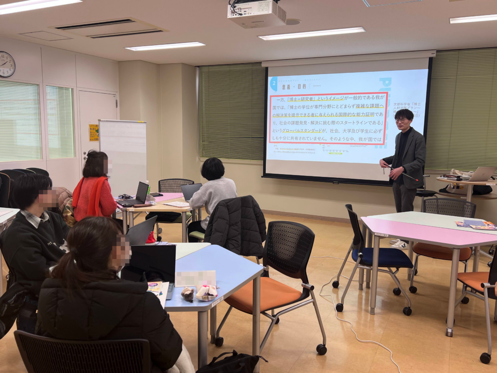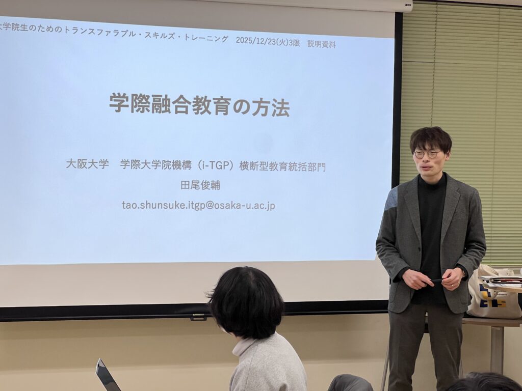 2025年12月23日(火)3限、学際融合教育科目「大学院生のためのトランスファラブル・スキルズ・トレーニング」(担当教員:キャリアセンター・家島明彦准教授)の1コマにおいて、田尾俊輔助教が「学際融合教育の方法」というタイトルでゲスト講義を実施しました。大阪大学の大学院教育システムや副専攻・高度副プログラムを紹介するとともに、他分野の人と共同研究を考えるワークを行い、専門力を伸ばすための副専攻的な学びの重要性を体感してもらいました。以下、授業を受けた受講生の感想です。学際教育や大学院共通教育に関する出張授業等のご依頼がありましたら、学際大学院機構までお知らせください。