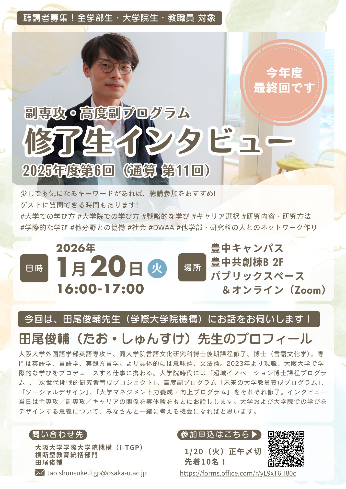 本件問合せ先 大阪大学学際大学院機構(i-TGP) 横断型教育統括部門 田尾俊輔 tao.shunsuke.itgp@osaka-u.ac.jp