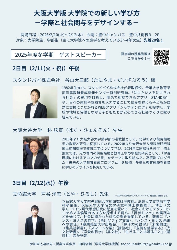 冬学期:2026/2/10(火)〜2/12(木)の3日間集中講義 @豊中キャンパス