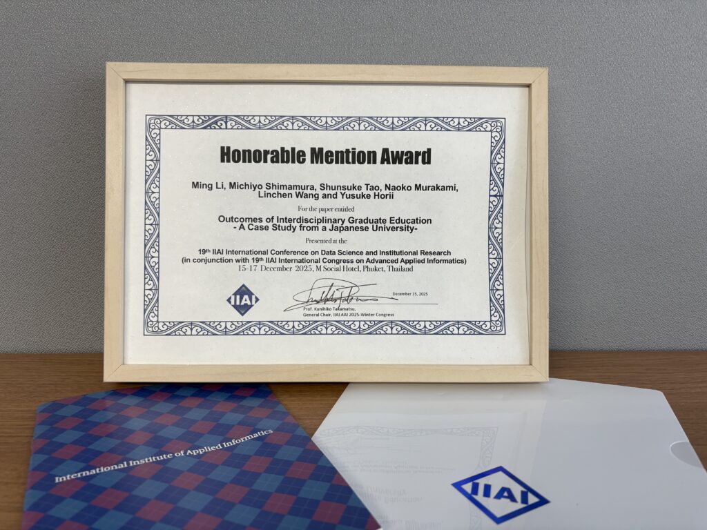 2025年12月15日〜17日にタイのプーケットで開催された19th IIAI International Congress on Advanced Applied Informaticsにて、李明准教授らが「Outcomes of Interdisciplinary Graduate Education – A Case Study from a Japanese University-」という題目で研究発表を行い、Honorable Mention Awardを受賞しました。学際大学院機構では、今後も学際教育の効果検証を進めていきます。